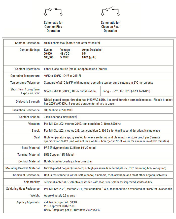Le thermostat de la série 6700 est dimensionnellement conforme à la norme internationale d’emballage de produits Y220/TO220. Ainsi, le 6700 peut être automatiquement placé et soudé sur des cartes PC avec un équipement automatisé à haute vitesse, éliminant ainsi le besoin de placement manuel et de terminaison coûteux, requis aujourd’hui pour la plupart des thermostats d’alimentation. Le 6700 fournit une réponse rapide et positive avec une excellente répétabilité. Le thermostat a une capacité de commutation allant jusqu’à 0,5 A pour 48 V CC et permet une commutation de bas niveau jusqu’à 0,001 A à 0,020 A à 5 V CC pendant 100 000 cycles. La température est préréglée en usine et n’est pas réglable sur le terrain.
