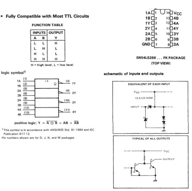 Le 266 est composé de quatre portes indépendantes NON-OU exclusif à 2 entrées avec sorties à collecteur ouvert. Les sorties à collecteur ouvert permettent de relier les sorties ensemble pour des comparaisons sur plusieurs bits.