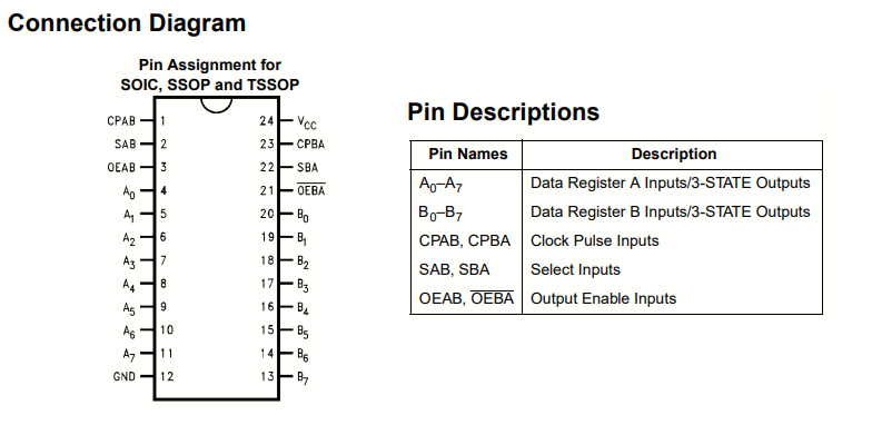 transmission multiplexée de données directement depuis le bus d’entrée ou depuis les registres internes. Les données sur le bus A ou B seront synchronisées dans les registres lorsque la broche d’horloge appropriée passe au niveau logique HAUT. Des broches d’activation de sortie (OEAB, OEBA) sont fournies pour contrôler la fonction de l’émetteur-récepteur.
