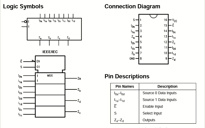 L’AC/ACT157 est un multiplexeur quadruple à 2 entrées haute vitesse. Quatre bits de données provenant de deux sources peuvent être sélectionnés à l’aide des entrées communes Select et Enable. Les quatre sorties présentent les données sélectionnées sous la forme vraie (non inversée). L’AC/ACT157 peut également être utilisé comme générateur de fonctions.