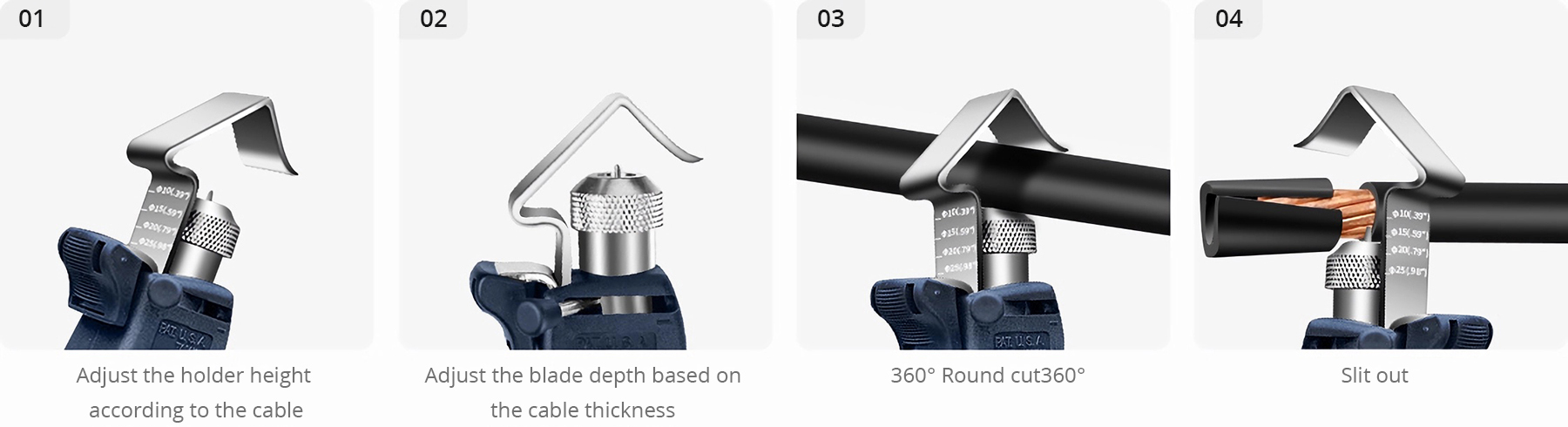 Lors d’une rotation dans le sens horaire, la profondeur de coupe est profonde et vice versa. Lorsque vous tournez le dispositif de réglage de la rainure en V dans le sens horaire, soulevez le support de câble et coupez le câble épais et vice versa.