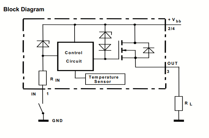 MOSFET de puissance vertical à canal N avec pompe de charge et entrée contrôlée en courant, intégré de manière monolithique dans la technologie Smart SIPMOS. Fournir des fonctions de protection intégrées.