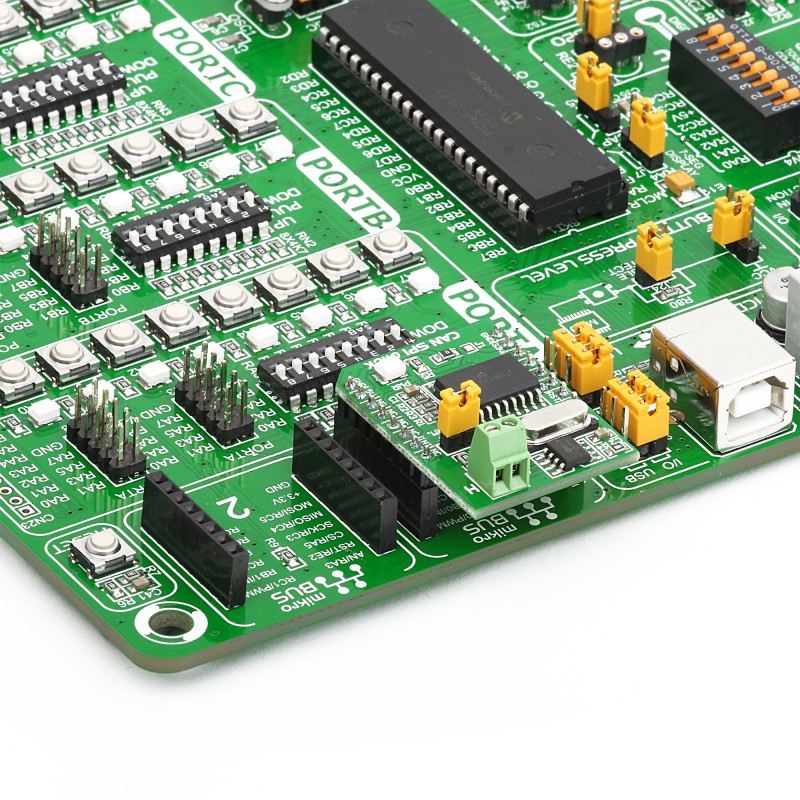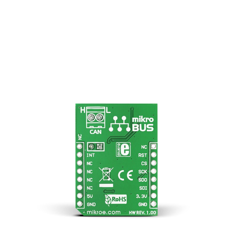 CAN SPI click 5V est une carte d’extension au facteur de forme mikroBUS. des possibilités de communication sur bus CAN à votre microcontrôleur via une liaison SPI grâce à un circuit intégré de type « MCP2551 » (version 5 V).La carte est conçue pour utiliser uniquement une alimentation 5V.