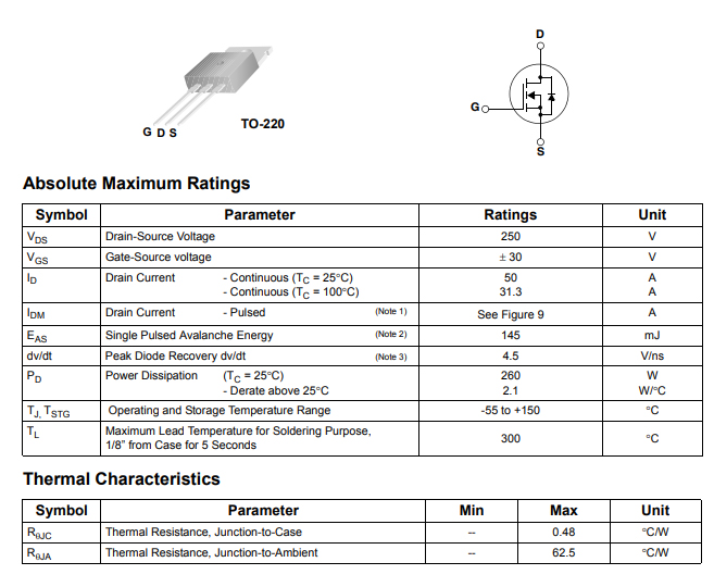 • 50A, 250V, RDS(on) = 36.3mΩ @VGS = 10 V