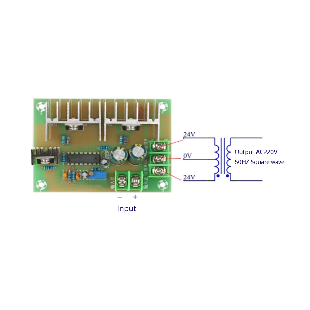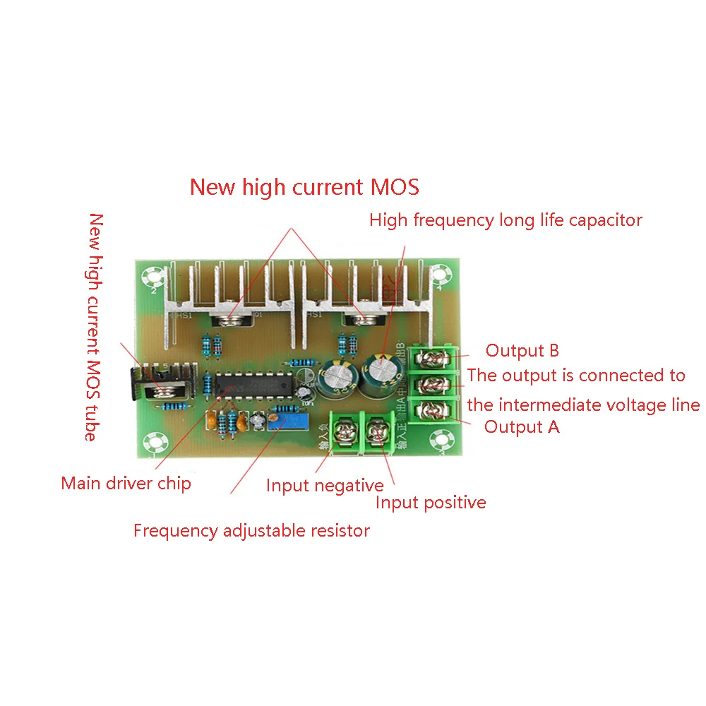 Cette carte mère est connecté à un double 12V transformateur à sortie 220V AC tension. S’adapter à la puissance transformateur dans 300W. Avant le module est expédié, la fréquence a été ajustée avec un oscilloscope numérique. Généralement, ne pas régler le potentiomètre. Le potentiomètre sur le conseil est utilisé pour fréquence fine-tuning.