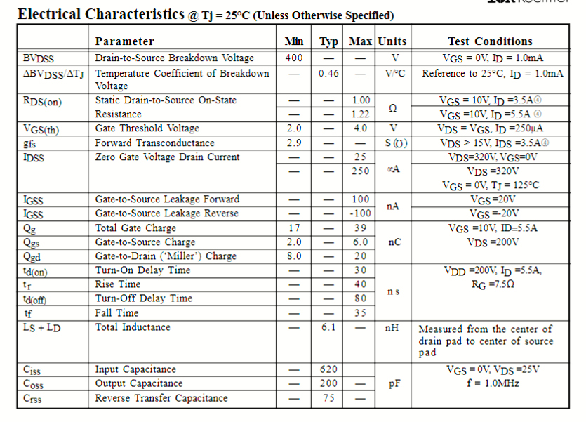 Les transistors HEXFET présentent également tous les avantages bien établis des MOSFET tels que le contrôle de tension, la commutation très rapide, la facilité de mise en parallèle et la stabilité en température des paramètres électriques. Ils conviennent parfaitement aux applications telles que les alimentations à découpage, les commandes de moteur, les onduleurs, les hacheurs, les amplificateurs audio et les circuits d’impulsions à haute énergie.