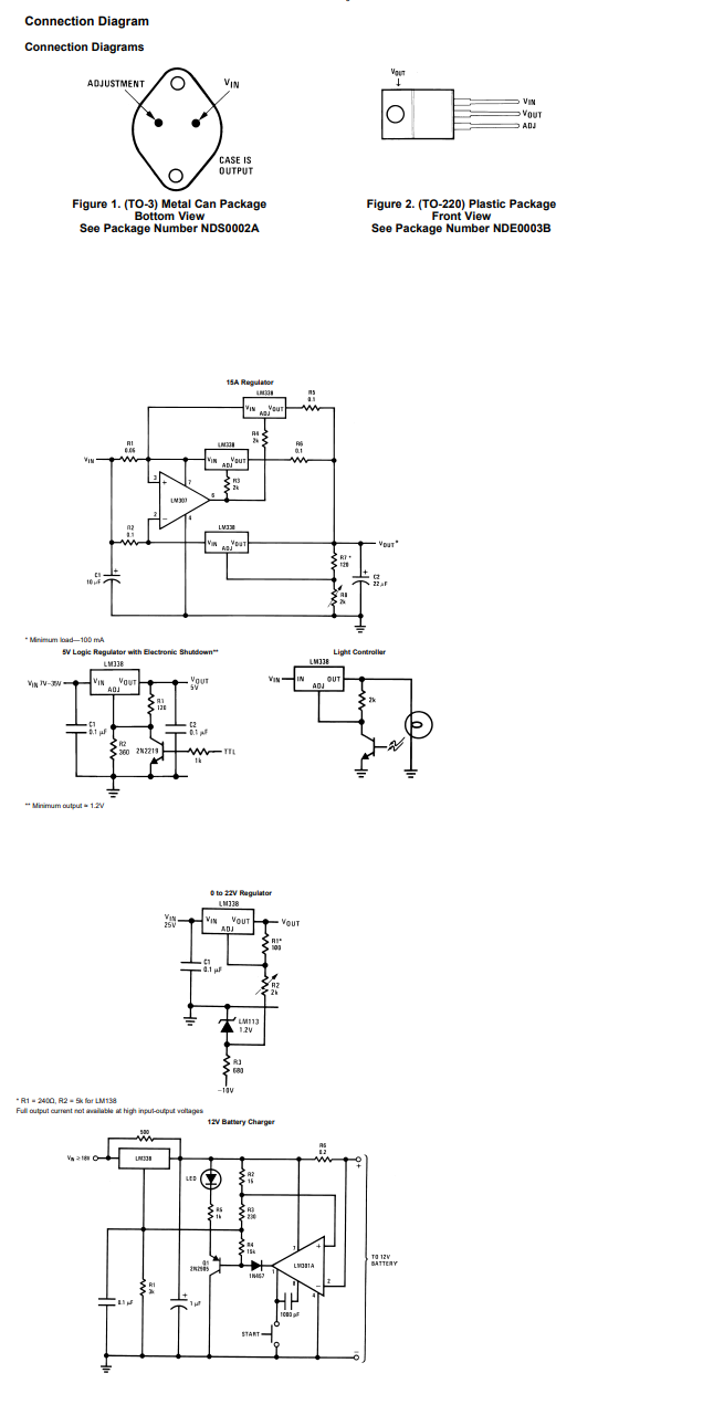 La série LM138 de régulateurs de tension positive réglables à 3 bornes est capable de fournir plus de 5 A sur une plage de sortie de 1,2 V à 32 V. Ils sont exceptionnellement faciles à utiliser et ne nécessitent que 2 résistances pour régler la tension de sortie. Une conception soignée des circuits a abouti à une régulation de charge et de ligne exceptionnelle , comparable à celle de nombreuses alimentations commerciales . La famille LM138 est fournie dans un boîtier de transistor standard à 3 broches.