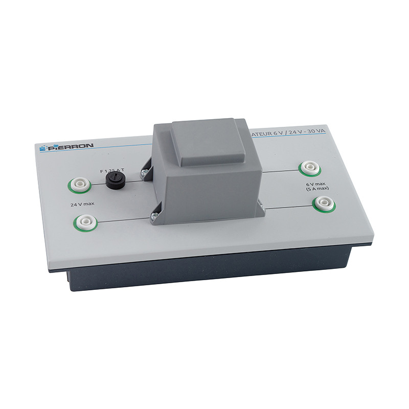 Il s’agit d’un transformateur moulé, monté sur un support isolé. Le primaire et le secondaire sont accessibles par douilles double puits. Ce produit permet d’étudier le transformateur, son rôle et ses caractéristiques : essai à vide, essai en court-circuit, essai en charge…