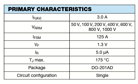 Boîtier : DO-201AD, époxy moulé sur corps en verre. Le composé de moulage est conforme à l’indice d’inflammabilité UL 94 V-0. Base P/N-E3 – conforme RoHS, qualité commerciale.