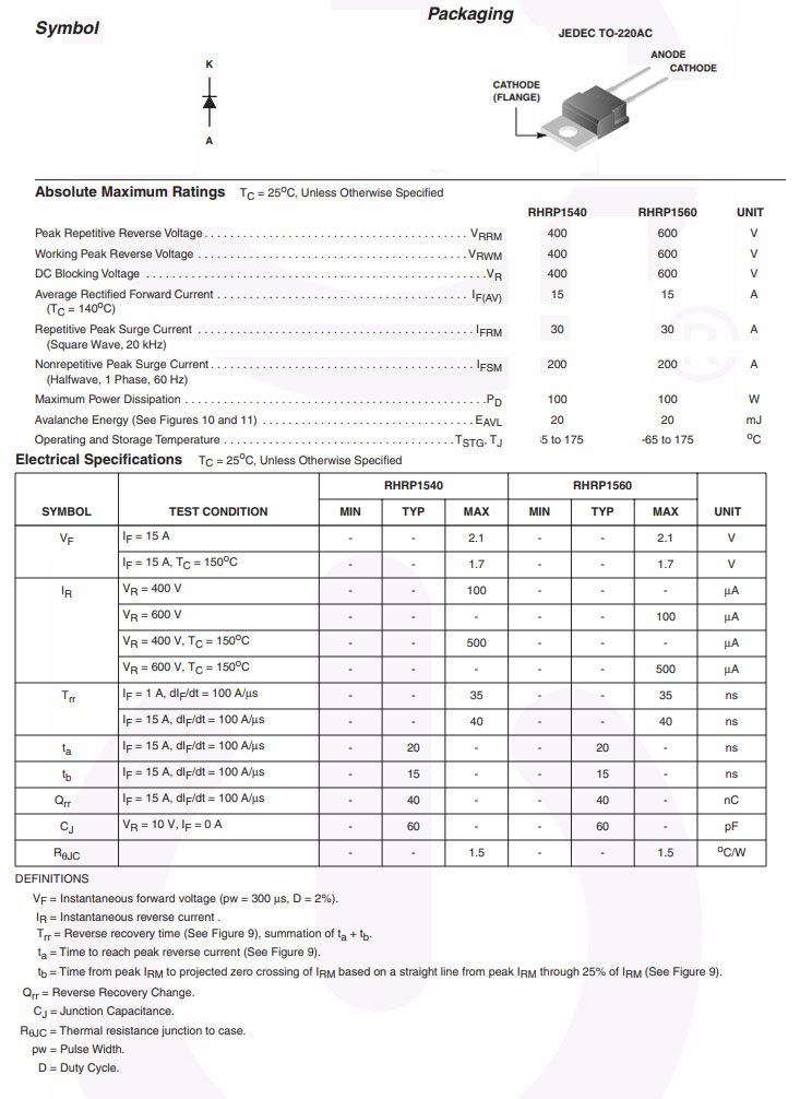 Le RHRP1540, RHRP1560 est une diode hyperrapide avec des caractéristiques de récupération douce. Il a le demi-temps de récupération des diodes ultrarapides et est une construction planaire épitaxiale à implantation ionique passivée au nitrure de silicium. Ces dispositifs sont destinés à être utilisés comme diodes et diodes de roue libre/de serrage dans diverses alimentations à découpage et autres applications de commutation de puissance. Leur faible charge stockée et leur récupération douce ultrarapide minimisent la sonnerie et le bruit électrique dans de nombreux circuits de commutation de puissance, réduisant ainsi la perte de puissance dans les transistors de commutation.